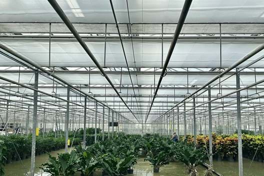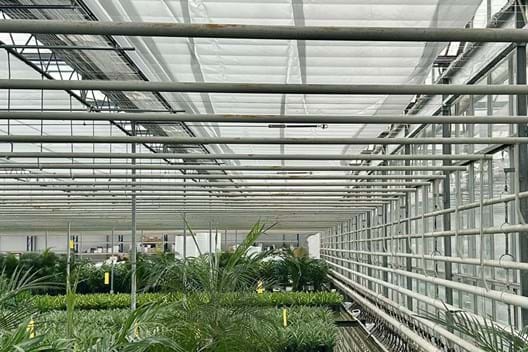 At VLM Hydroculture in Made, we installed a second energy screen with a push-pull drive, a conscious choice made by the grower based on previous positive experiences. Luxuous 1547 D FR from Svensson was chosen as the screen fabric. This fabric combines diffuse light distribution with high insulation value. This ensures even light distribution, protects the plants from bright sunlight, and reduces energy consumption. A perfect match, fully tailored to the grower's needs.