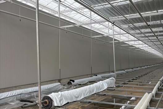 Nach der Verglasung begannen wir mit der Installation der technischen Systeme. Erst ganz am Ende des Bauprozesses kamen wir zurück, um das Gewächshaus mit der Montage der Schirme fertigzustellen. So stellen wir sicher, dass diese sauber, unbeschädigt und sofort einsatzbereit sind. In diesem Gewächshaus installierten wir oben ein hochisolierendes, blickdichtes Aluminiumgewebe von Phormium und unten ein transparentes Energiegewebe von Svensson. Eine leistungsstarke Kombination aus Energieeinsparung und maximaler Anbauqualität.