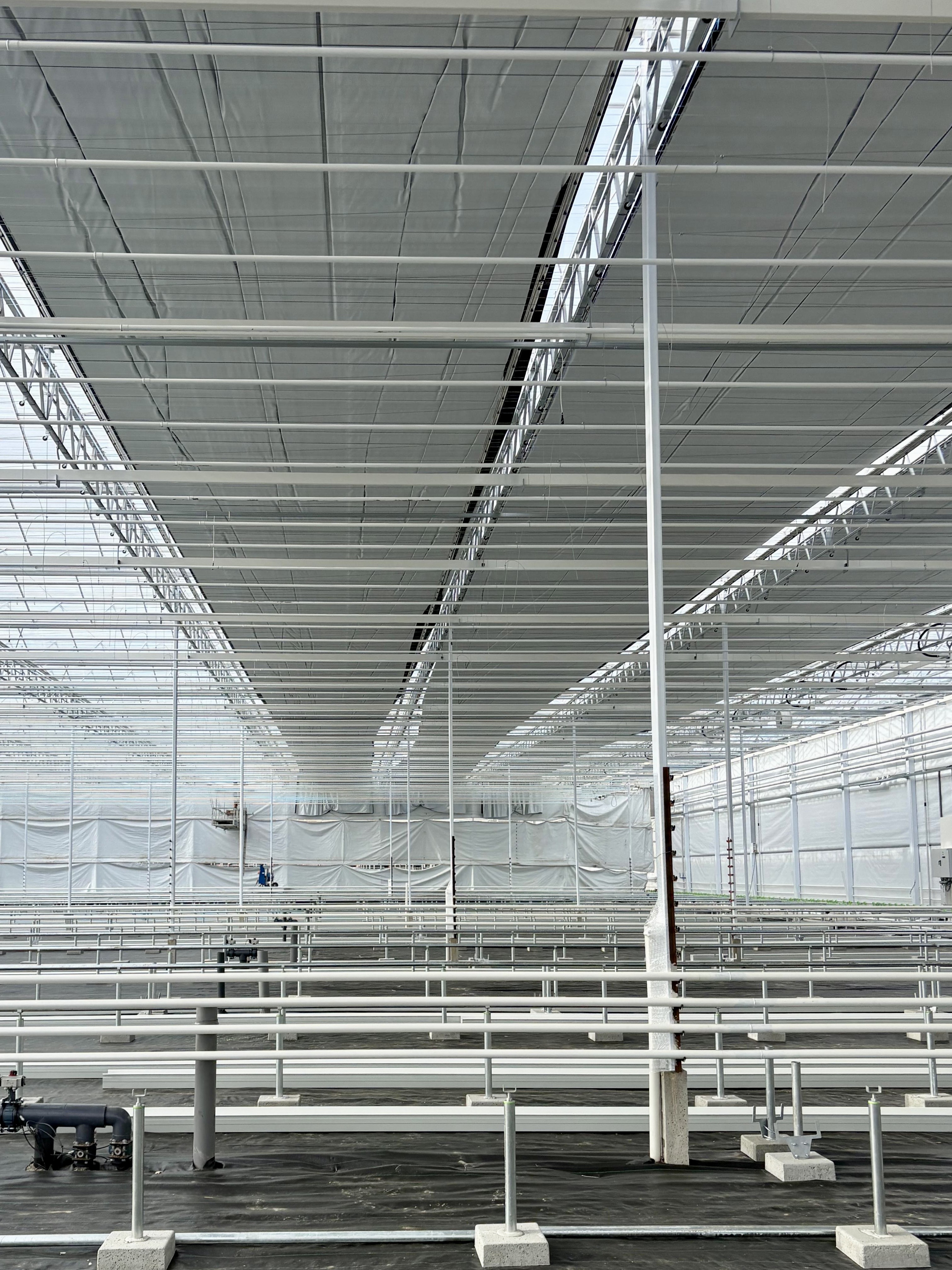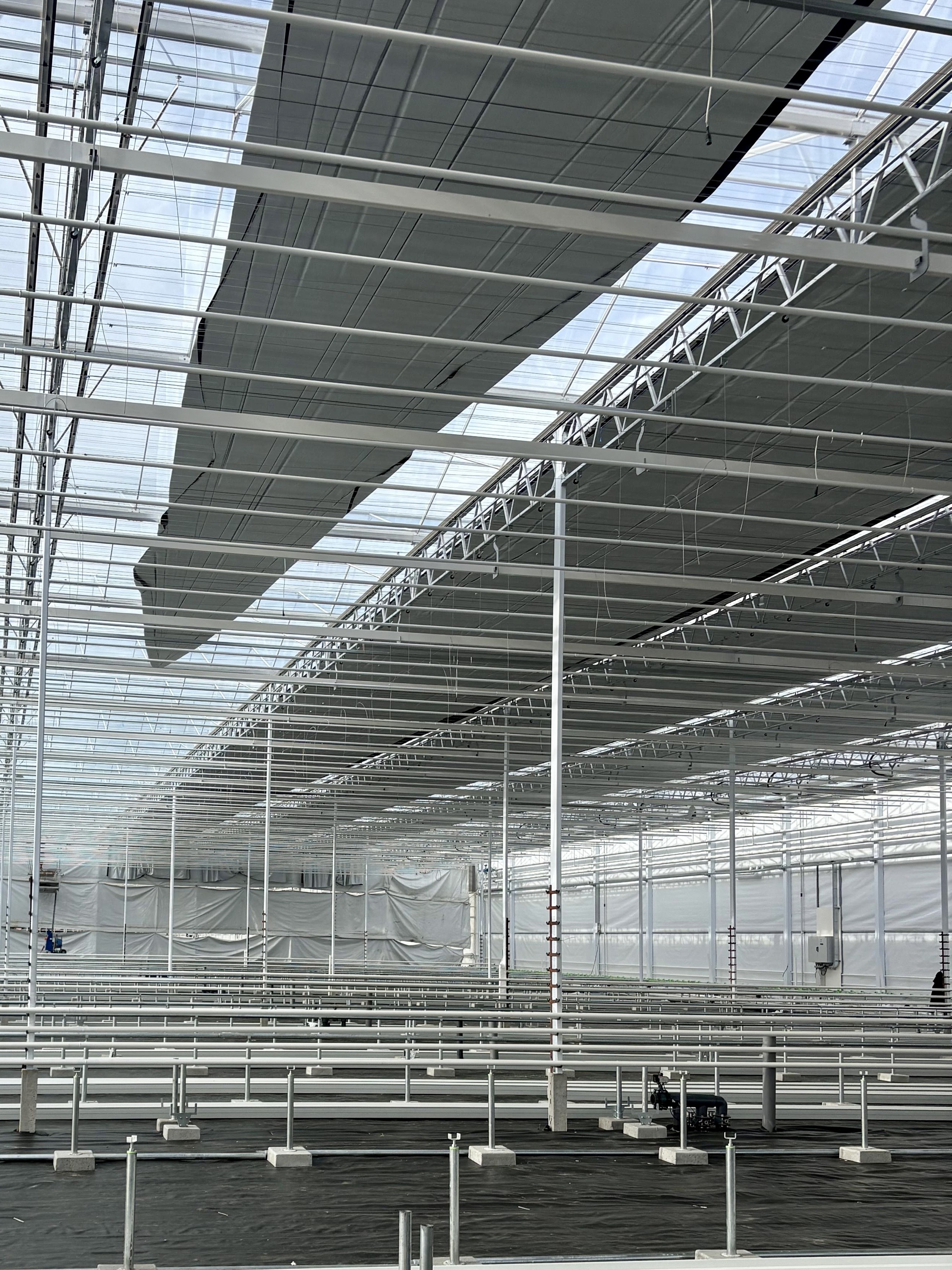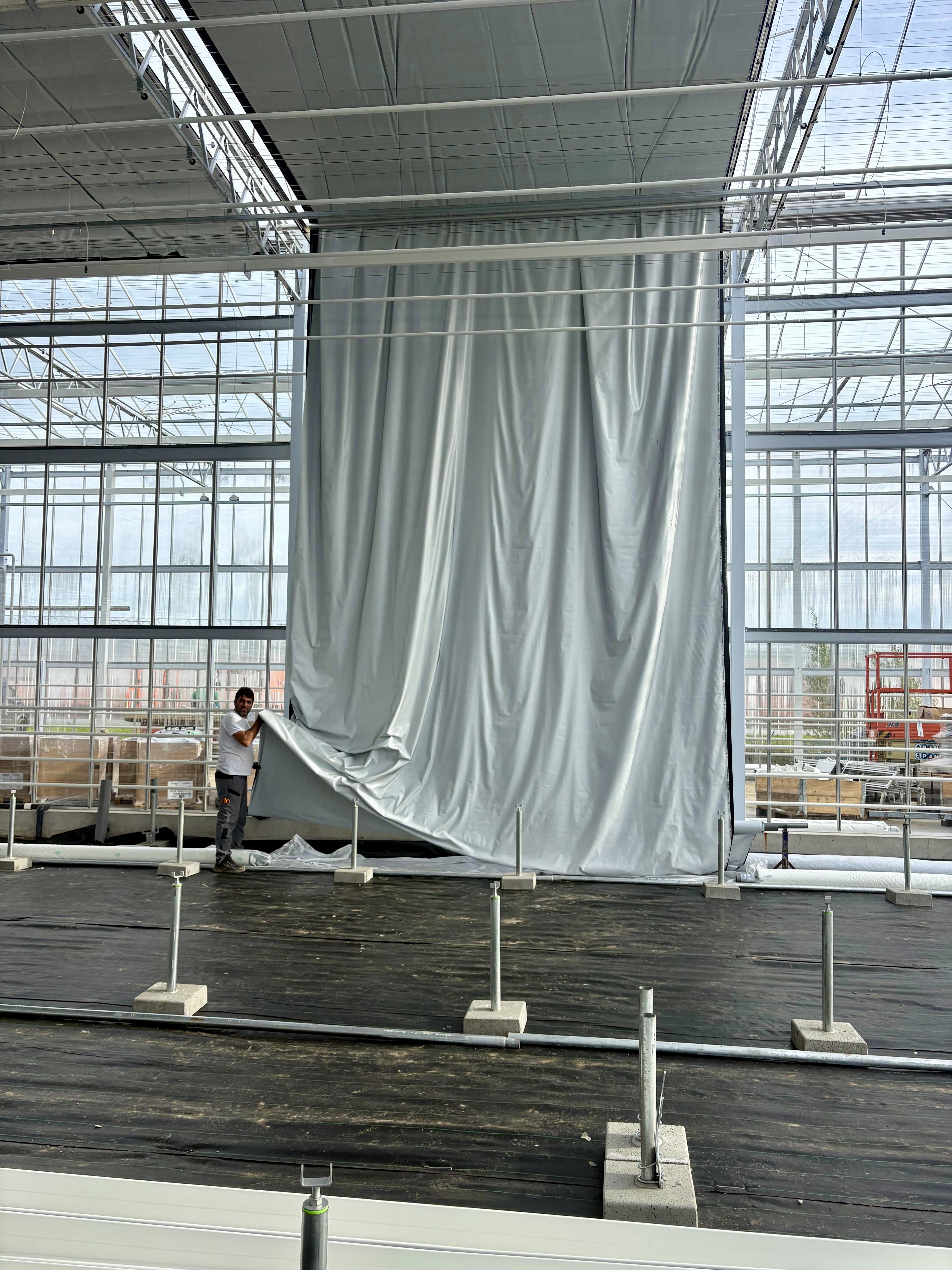 Satter Roses is uitgebreid met 1,5 ha! Wij hebben de nieuwbouw voorzien van een dubbele scherminstallatie, maar de inbouwruimte was beperkt. Daarom hebben we de schermen zo dicht mogelijk op elkaar gemonteerd, met beide aandrijfassen onder het onderste scherm. In combinatie met onze Dynamic trekdraad is deze installatie 100% klaar voor intensief gebruik. Om de gehele kas tot slot volledig licht- en energiedicht te maken hebben we de kas rondom ook nog voorzien van rolgevels. Alles voor het creëren van het ideale klimaat voor prachtige, sterke potrozen!